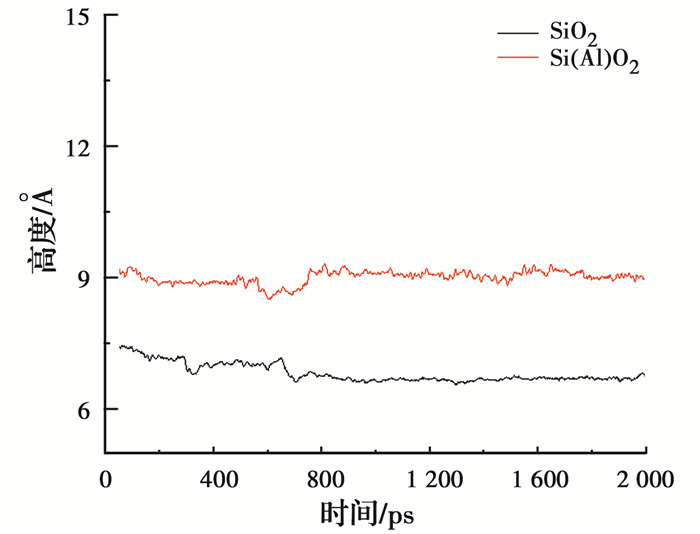 为了全面描述环氧树脂的构象变化,分析环氧树脂的质心高度差异,即环氧树脂质心与基底表面之间的距离,如图 6所示。对于纯二氧化硅基底,环氧树脂的质心高度从初始的13 Å逐渐变化到6.7 Å,表明环氧树脂与二氧化硅基底之间的距离越来越近,粘结良好。但在掺铝二氧化硅基底,环氧树脂分子的质心高度从12.2 Å变化到9 Å,表明二氧化硅基底掺入铝原子之后,环氧树脂与基底间距离增加、纤维-树脂两相间粘结性能减弱。