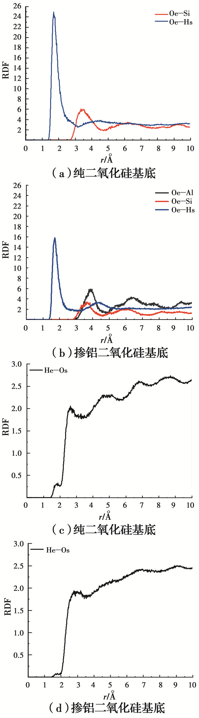 计算环氧树脂原子(Oe、He)与基底原子(Hs、Si、Al、Os)的径向分布函数(RDF),如图 8所示,即通过离子区域密度与平均密度之比反映离子周围结构环境,以此表征环氧树脂的微观结构以及与两种基底之间的界面相互作用。Oe—Hs反应原子对的RDF在2 Å附近均有明显峰值(图 8(a)、(b)),表明Oe与Hs之间有强烈的氢键作用[27],且图 8(a)二氧化硅基底中Oe—Hs的RDF曲线峰值明显高于掺铝二氧化硅基底。研究表明,在C—A—S—H凝胶表面的铝羟基具有亲水性,铝羟基提供的氧位点能够接受溶液中水分子的氢键[25-26],环氧树脂由于其疏水性与铝羟基作用较差,因此,二氧化硅基底部分硅原子被铝原子取代之后,其与环氧树脂粘结性能减弱。