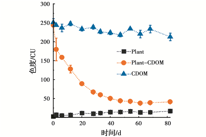 不同处理组中芦苇对CDOM的脱色效果见图 1。在整个实验过程中,植物-有机质实验组表现出较好的脱色效果(84%),在前40 d,植物便将色度从244 CU降至50 CU,此后色度稳定在37~44 CU之间。植物对照组因为没有添加CDOM,其初始色度接近于零(2.6 CU),但随着实验的进行,其色度缓慢上升到17 CU,这可能是植物释放的分泌物中含有CDOM所致,但整体色度变化不大,可以忽略不计。有机质对照组因为缺少植物的作用,色度在82 d里仅从251 CU下降到213 CU。可见CDOM的自然水解速度十分缓慢,其脱色效应主要依赖于植物的作用。一方面,植物可以通过直接吸收和吸附CDOM来减少其环境含量;另一方面,植物根系可以为微生物提供生长介质,从而间接促进CDOM的生物降解。