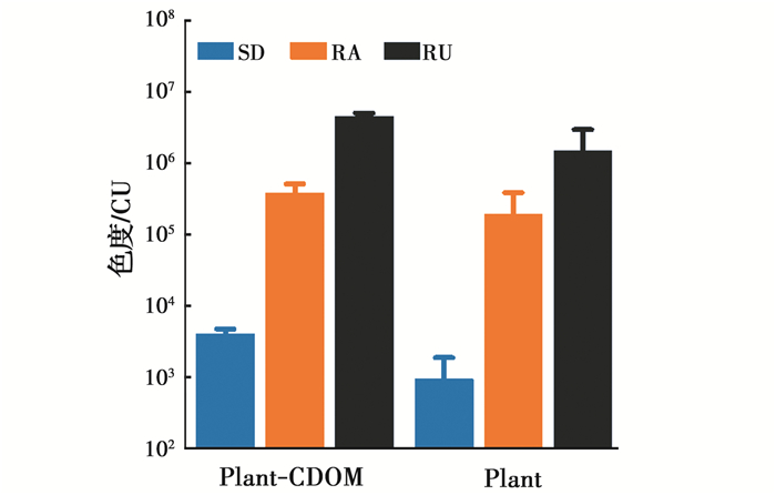 植物根系、根系附着物及容器底部沉淀物中CDOM提取液的色度见图 2。根系吸收、根系附着、沉淀物中CDOM色度分别为4.6×106、3.8×105、4.0×103 CU,且色度在这3种组分中的占比依次为92.20%、7.71%、0.08%。由此可见,CDOM大部分被根系吸收到植物体内,少部分吸附在植物根表,只有极少量残渣与根系分泌物共同絮凝沉降在容器底部。虽然浓度相差甚远,植物-有机质实验组和植物对照组中CDOM的分布规律基本一致,说明植物本身也含有一定量的CDOM[16],且植物对不同浓度CDOM的去除方式均为根系吸收为主、根表吸附为辅。