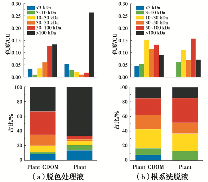 脱色处理液中CDOM不同分子量占比如图 3(a)所示。有机质对照组中高分子CDOM(分子量>100 kDa)的占比(67%)高于植物-有机质实验组(33%),表明植物可以促进CDOM分解,从而达到低分子化的效果。然而,有机质对照组中低分子CDOM(分子量 < 10 kDa)的占比(21%)也高于植物-有机质实验组(11%),这可能是因为低分子有机质容易被植物吸收,从而转移进入植物体内[17]。