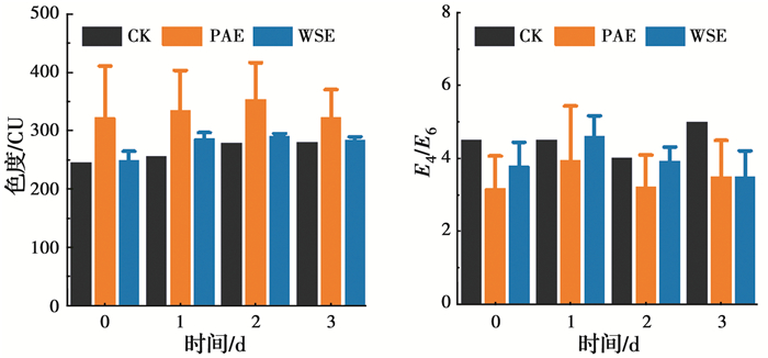 根系分泌液脱色实验结果如图 4所示。随着时间的推移,CDOM的色度和E4/E6值在不同根系分泌物中均十分稳定,分别为249~290 CU和3.5~4.6(水溶性分泌物)、322~353 CU和3.2~4.0(根系附着分泌物)、245~280 CU和4.0~5.0(无添加对照样)。其中,水溶性分泌物的色度范围与无添加对照样非常相近,但低于根系附着分泌物;而根系附着分泌物的E4/E6值则略低于另外两种。由此可知,不但芦苇根系分泌物对CDOM的脱色及其腐殖化过程均无直接影响,而且植物分泌的CDOM分子量较大,附着在植物根表上不易随水流动,这与前面发现的低分子CDOM易被吸收进入植物体内的结果相呼应。