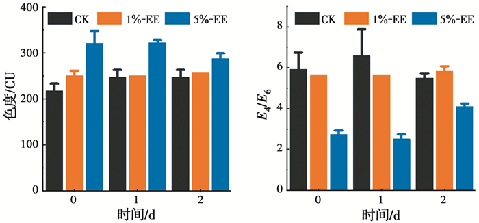 酶提取液脱色实验的结果如图 5所示。随着酶提取液添加量的提高,CDOM的反应呈现如下规律:在无添加对照样中,色度从217 CU上升到246 CU,且E4/E6值从5.9下降到5.5;在1%酶提取液添加样中,色度和E4/E6值均十分稳定,分别为250 CU和5.6;而在5%酶提取液添加样中,色度从321 CU下降到288 CU,且E4/E6值从2.7上升到4.1。表明植物酶可以作用于CDOM的低分子化进程,从而起到脱色的效果,这就解释了在CDOM组成成分分析中观察到植物能够使CDOM低分子化的原因。