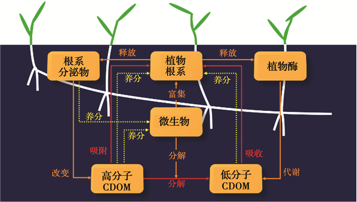 3) 吸附在根系表面的高分子CDOM能作为碳源被根际微生物利用,经降解变成低分子CDOM后可通过根系吸收进入植物体内,并受到植物酶的代谢作用被进一步分解矿化,从而完成植物对CDOM的净化作用。
