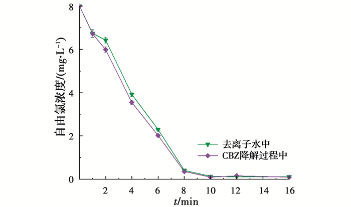 在pH值为6、初始自由氯投加量为8 mg/L的条件下,探究真空紫外辐射下自由氯在去离子水中和CBZ降解过程中的衰减,如图 10所示。