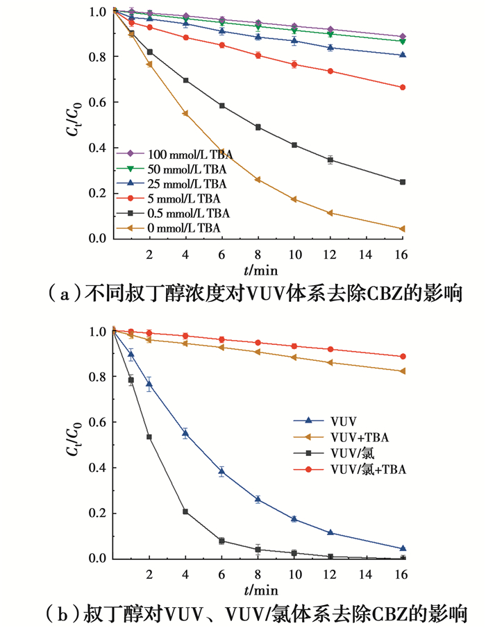 相关研究表明[13-14, 21],VUV体系中存在多种活性物质,如OH·、O2-·、HO2-·等强氧化性自由基,VUV/氯体系中除上述活性物质外还主要存在Cl·、Cl2-·等自由基[15]。为了鉴别VUV/氯氧化体系降解CBZ的主要活性物质,采用叔丁醇(TBA)淬灭HO·和Cl·。在VUV体系中加入不同浓度TBA,探究VUV体系下CBZ的主要降解方式;在VUV/氯体系中加入100 mmol/L叔丁醇,探究体系内除HO·之外的其他活性物种。其他试验条件为:初始CBZ浓度为30 μmol/L、pH值为6、氯投加量为8 mg/L。试验结果如11所示。