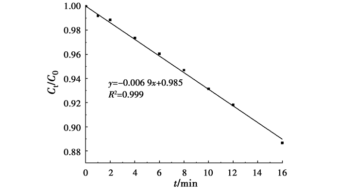 由图 11(a)可以知,随着TBA浓度的增高,CBZ的去除受到抑制作用越强,但添加50、100 mmol/L TBA后CBZ去除速率基本相同,表明100 mmol/L的TBA已经足够淬灭VUV体系中的HO·。投加100 mmol/L的TBA,16 min内CBZ的去除率为11.3%,表明HO·是VUV体系降解CBZ的主要活性物质之一。投加了100 mmol/L淬灭剂后,CBZ的降解曲线呈现良好的线性相关性,线性拟合结果如图 12所示,其线性相关度良好,R2为0.999,因此,足量淬灭剂下CBZ降解符合零级动力学,表明VUV体系内CBZ会发生直接光解行为。Wen等[22]研究发现,185、254 nm紫外均会直接光解亚甲基蓝(MB),这与本研究相似。因此,在VUV体系中,CBZ的降解作用主要为HO·氧化和直接光解。