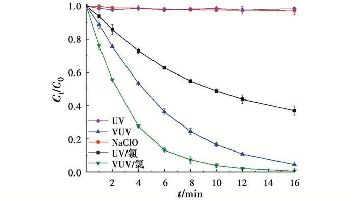 对比考察单独UV、单独VUV、单独自由氯、UV/氯、VUV/氯对CBZ的去除效果;具体试验条件为pH值为6、自由氯投加量为8 mg/L;试验结果如图 2所示。