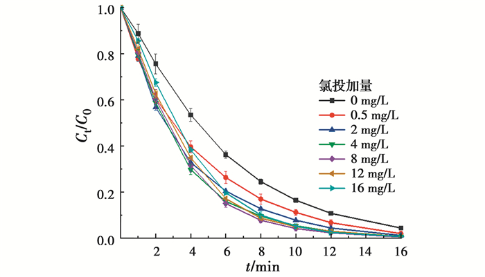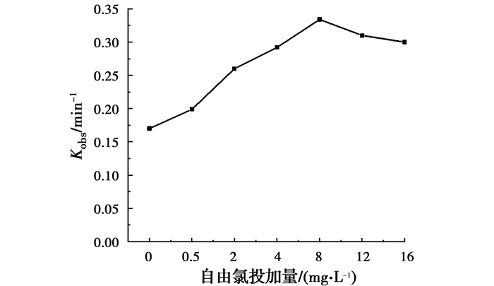 由图 3、图 4可知,随着自由氯投加量从0 mg/L增加到8 mg/L,CBZ的降解速率逐渐增加,表观速率常数从0.170 min-1增加到0.339 min-1,表观速率常数提高了1倍;继续增加自由氯投加量,CBZ的降解速率表现出轻微降低。氯投加量为8 mg/L时,CBZ的降解速率最快。