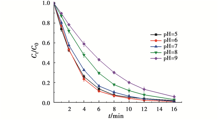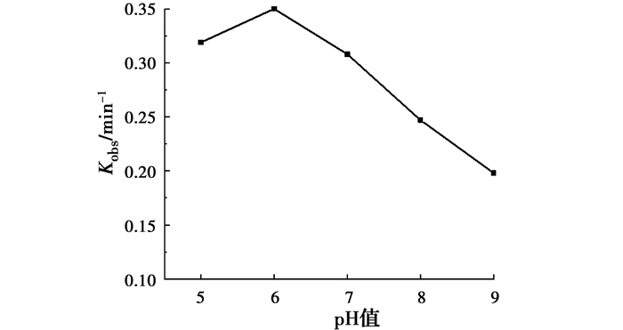 在CBZ初始浓度为30 μmol/L、自由氯投加量为8 mg/L的条件下,探讨反应pH值对CBZ去除效果的影响,如图 5所示;对试验结果按照伪一级动力学拟合,其表观速率常数如图 6所示。