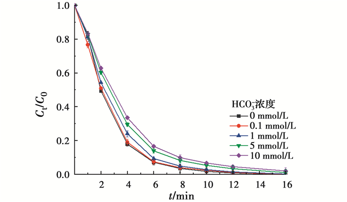 由图 7和表 2可知,总体来讲,HCO3-对VUV/氯体系降解CBZ具有抑制作用。具体表现为,HCO3-浓度为0、1、5、10 mmol/L对应的表观速率常数kobs分别为0.350、0.321、0.302、0.256、0.233 min-1,kobs依次减小,表明随着HCO3-浓度增大,CBZ的降解速率变慢。
