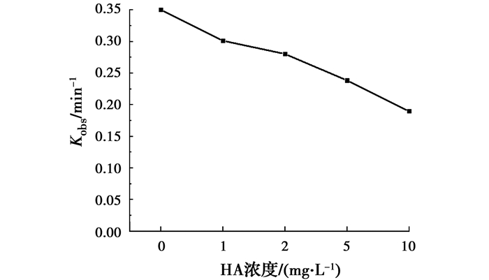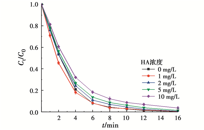 腐殖酸(HA)是常见的天然有机物,广泛存在于天然水体中。天然腐殖酸具有较强的吸光性能,文献报导[22],在光辐照下,天然有机物可以产生HO·、1O2、H2O2等活性氧化物种,可以加强污染物降解。