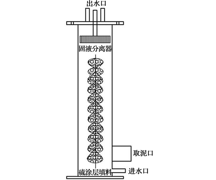 采用的反应器为上流式厌氧反应器,其有效体积为2.5 L,直径为90 mm,有效高度为400 mm,材质为有机玻璃,内部设有固液分离器。反应器内部挂上自制的硫磺粉涂层填料,实际填充比(填料体积∶反应器有效体积)为1/10~1/5,连续流运行方式为下进上出,进水流量由蠕动泵控制。夏季反应器温度保持在(25±1) ℃,冬季通过水浴加热的方式使反应器温度控制在(30±1) ℃。为避免光照对硫自养反硝化菌的伤害,反应器外部用铝箔纸包裹避光。实验装置如图 1所示。