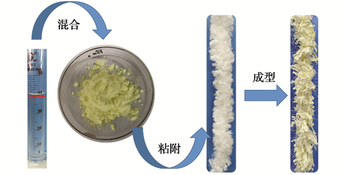 制备方法:填料制备流程见图 2。根据反应装置的内部尺寸,截取长度为350 mm的生物绳填料,然后按照胶黏剂40 mL+硫磺粉50 g的配比将硫磺粉混匀至黏稠状,有利于硫磺粉粘附在生物绳填料上。接着,将混匀的硫磺粉全部涂刷到生物绳填料上,悬挂晾干至重量无变化。负载到填料上的硫磺粉质量M按式(2)计算。