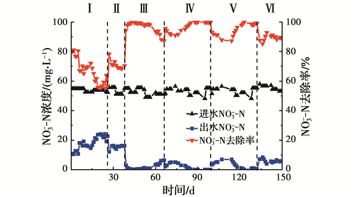 采用自制的硫涂层填料和反应器在实验室进行连续运行,共运行5个月。反应器密封后,通过蠕动泵进水以灌满装置,静置3 d,主要使装置内活性污泥中的微生物得到培养和驯化。整个反应过程分为6个阶段(见表 1),阶段Ⅰ、Ⅱ、Ⅲ主要考察填料填充比和温度对反应器脱氮性能的影响;阶段Ⅳ、Ⅴ、Ⅵ保持填料填充比、反应器温度和进水NO3--N浓度一致,通过缩短HRT对反应器进行优化。其中,阶段Ⅱ、Ⅳ、Ⅴ为反应器内部填料更换阶段。待反应器稳定运行后,取稳定运行阶段中的反应污泥进行扫描电镜观察和微生物高通量测序分析。