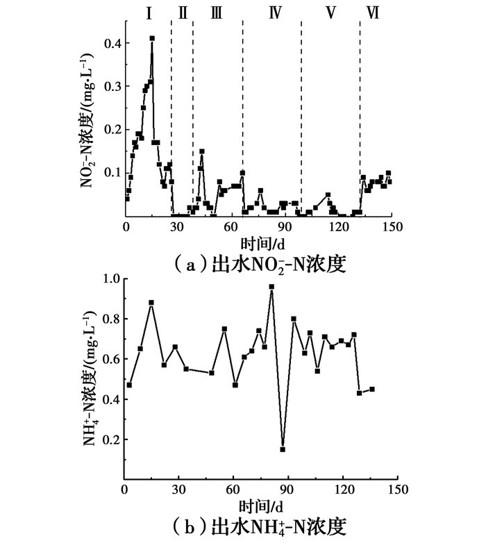 对出水NO2--N含量进行检测,发现各个反应阶段的NO2--N浓度均很低,其中浓度最高为0.41 mg/L(图 4(a)),远远低于中国城镇污水排放标准限值。这表明在反应器脱氮过程中,NO3--N主要还原成N2,因此,出水中只有极少量的NO2--N积累。其中,在填料填充比为1/10,HRT=19.5 h,T=(25±1) ℃条件下(阶段Ⅰ),NO2--N平均积累量高于其他反应阶段,这可能是因为填料上生物膜的积累阻碍了传质,降低了NO3--N的处理效果[29]。此外,出水氨氮含量均低于1 mg/L(图 4(b)),说明在脱氮过程中整个反应器硝酸盐氮基本完全转化成了氮气。