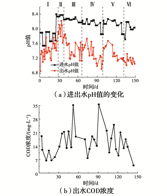 实验测试了反应器进出水pH值和出水COD浓度的变化。图 5(a)表明,每个阶段的出水pH值均低于进水,这主要与硫自养反硝化过程产生H+有关。其中,当填料填充比为1/10、HRT=19.5 h、T=(25±1) ℃时(阶段Ⅰ),出水pH值波动较小,保持在6.8~7.8之间。而增加填料填充比至1/5时(阶段Ⅱ~Ⅲ),出水pH值随着反应的进行呈逐渐下降的趋势,这主要与每个阶段的脱氮效果有关。相比阶段Ⅱ、Ⅲ,阶段Ⅰ的脱氮率较低(图 3),在相同条件下,产生的H+较少,基本上能被进水中的HCO3-中和;相反,当填料填充比提升至1/5后,反应器在单位时间内还原的NO3--N较多,对应产生的H+也较多,换句话说,随着反应的进行,产生H+的能力大于进水碱度中和H+的能力。因此,阶段Ⅱ和Ⅲ出水pH值趋于下降。在随后的HRT调控反应阶段,pH值变化情况与阶段Ⅱ、Ⅲ相似,也呈逐渐降低的趋势。总体来说,出水pH值在6.8~8.3之间,均趋于中性或弱碱性,不会引起出水pH值超标。