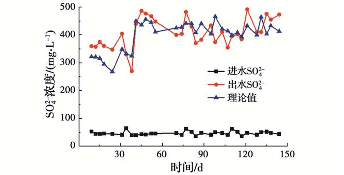 SO42-是研究过程中单质硫氧化检测的唯一产物,图 6为整个反应阶段出水SO42-的浓度。反应初期,出水SO42-浓度高于理论值,除了硫自养反硝化外,可能还存在人工配水(无机废水)中源源不断的DO输入,形成好氧硫氧化[30]。到了第45天,出水SO42-浓度达到最高,为486.32 mg/L;在第67~149天, 出水SO42-浓度基本稳定在(400±50) mg/L左右。总之,在0~38、39~66和67~149天,出水SO42-浓度平均分别为350.33、463.56、417.91 mg/L。出水SO42-浓度与NO3--N的去除量有关,且在第39~149天,生成的SO42-含量与理论计算值相差不大,这与Sahinkaya等[31]的研究结果基本一致,推测可能与反应器内发生部分异养反硝化有关。Sun等[30]分别以硫代硫酸钠、硫代硫酸钠联合乙酸钠为电子供体进行自养反硝化和自养-异养耦合反硝化二级出水脱氮研究,结果表明,自养-异养耦合反硝化工艺的脱氮效果最佳,且有效降低了出水SO42-浓度。He等[32]研发了一种新型循环反硝化过滤器,并以白松和单质硫颗粒为填料进行含盐废水处理,实现了较高的脱氮率,降低了SO42-的积累。此外,Sahinkaya等[33]和Liu等[34]利用异养和硫自养反硝化进行饮用水处理,可有效控制出水SO42-浓度,且出水SO42-浓度均低于中国生活饮用水最低标准250 mg/L。故与现阶段已有研究相比[12, 35],实验可能是由于进水中少量有机物或者填料上的部分有机物被异养反硝化菌利用,进行部分异养反硝化作用,从而减少了SO42-的产生。