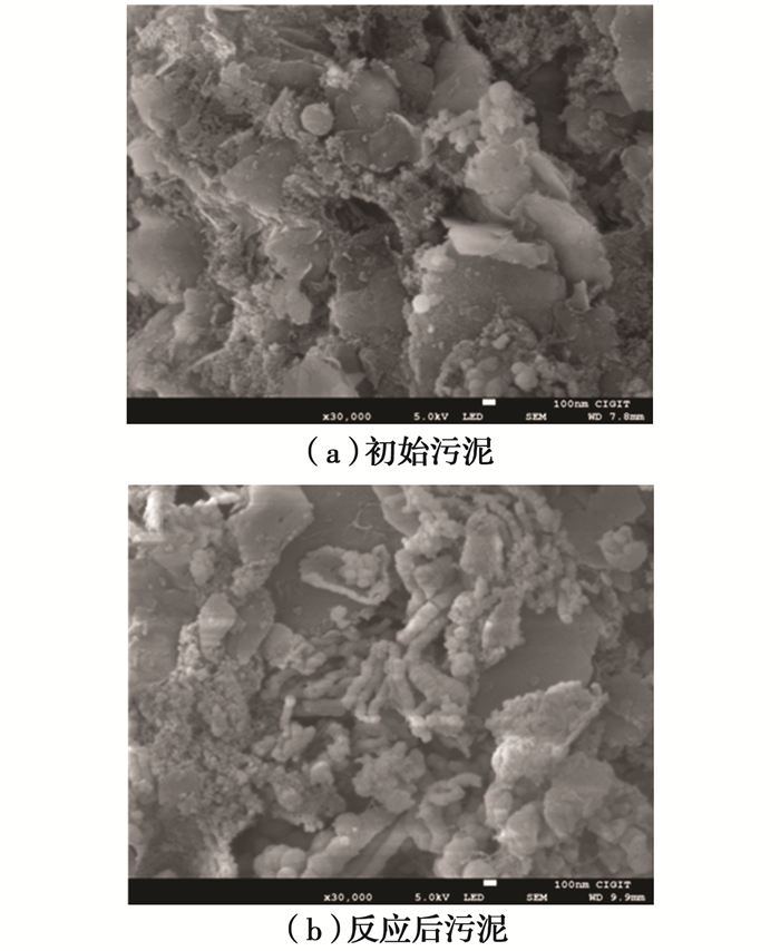 取初始污泥和反应器稳定运行后阶段Ⅲ中的污泥进行SEM微生物形态观察分析。如图 7(a)所示,初始污泥形状均不规则,且疏松多孔,表面粗糙,这为微生物的附着生长提供了场所。待反应器成功启动且稳定运行后,取阶段Ⅲ的反应污泥进行SEM微生物形态观察,结果见图 7(b),发现污泥表面附着有明显且形状规则的杆状微生物,这与实验在电子显微镜下观察到的硫自养反硝化微生物形态一致。马潇然等[36]通过对硫自养反硝化系统稳定运行时期的污泥进行扫描电镜观察,结果表明,污泥中存在一些短杆菌和球状菌。此外,赵晴等[37]研究指出,以硫化物为电子供体的自养反硝化污泥中细菌形态主要为球状和短杆状。