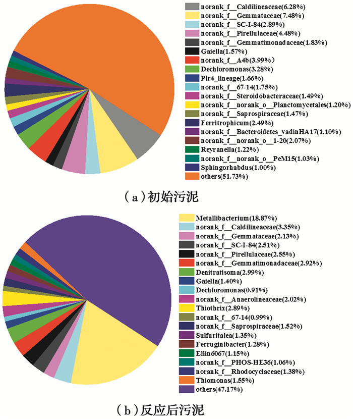 如图 8(a)所示,初始污泥中微生物多样性丰富,相对丰度排名前7位的属分别是:norank_f—Gemmataceae(7.48%)、norank_f—Caldilineaceae (6.28%)、norank_f—Pirellulaceae (4.48%)、norank_f—A4b(3.99%)、Dechloromonas (3.28%)、norank_f—SC-I-84(2.89%)和Ferritrophicum(2.49%)。其中,Dechloromonas是一种可利用有机碳源为电子供体、NO3--N为电子受体进行反硝化的异养反硝化菌[1, 38];有研究表明[2],Ferritrophicum是一种嗜中性且微好氧的铁氧化菌,在低氧条件下富集,可将Fe2+还原成Fe3+。因此,反应器启动初期,初始污泥中的异养反硝化菌可以利用水中少量有机物或者填料上的有机物作为电子供体进行反硝化。但是,在反应后污泥中(图 8(b)),Metallibacterium、norank_f—Caldilineaceae、Denitratisoma、norank_f—Gemmatimonadaceae和Thiothrix是主要优势菌属,其占比分别为18.87%、3.35%、2.99%、2.92%和2.89%。Denitratisoma是一种典型的可利用NO3--N为电子受体的异养反硝化菌,具有去除氮和其他化合物的能力[1, 28];Thiothrixs是一种硫自养反硝化菌,在厌氧条件下,可以将NO3--N还原为N2,从而达到脱氮的目的[30]。此外,系统中与硫自养反硝化相关的菌属还有Thiomonas[2]和Sulfuritalea[30],其相对丰度分别为1.55%和1.35%。综合以上数据,推断出实验中主要进行硫自养反硝化和部分异养反硝化作用。