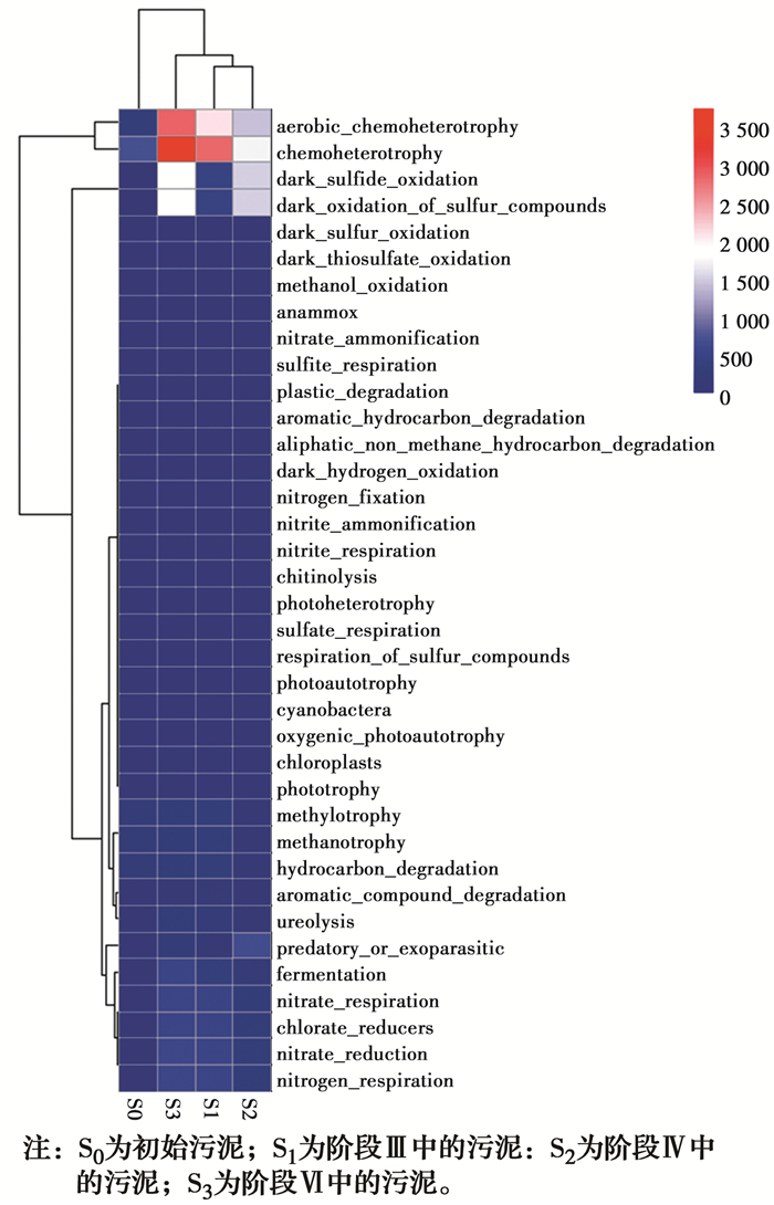 与初始污泥的微生物功能预测结果相比,反应后各阶段中与硫循环和氮循环相关的功能注释强度均有所增加。其中,初始污泥以及反应阶段Ⅲ、Ⅳ、Ⅵ中的dark_sulfide_oxidation强度分别为0、472、1 527和1 807,nitrate_reduction强度分别为34、537、314和586,说明在整个脱氮系统中,微生物主要进行的是硫代谢和氮代谢,且随着反应的进行,二者代谢强度有所增强。根据聚类分析关系可知,nitrate_respiration、nitrate_reductio和nitrogen_respiration联系紧密;dark_Sulfide_oxidation、dark_sulfur_oxidation、dark_thiosulfate_oxidation和dark_oxidation_of_Sulfur_compounds联系紧密,这也说明了体系中硫、氮代谢对脱氮起着关键作用。此外,各阶段功能预测中均存在一定强度的异养反硝化作用,说明脱氮体系中有部分异养反硝化作用参与,进而推断本系统中主要进行硫自养反硝化作用和部分异养反硝化作用。