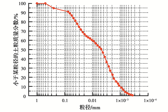 不含污染物的试验用土取自江苏省南京市南京南站附近某工地,其基本物理化学性质指标见表 1,试验用土是一种典型的低液限黏土。土的液塑限、比重和粒径分布根据《土工试验方法标准》(GB/T 50123—2019)[14]测得,最大干密度和最佳含水率(质量分数)根据标准试验方法ASTM D698[15]测得,pH值、氧化还原电位和电导率根据标准试验方法ASTM D4972-01[16]测得。试验用土的级配曲线如图 1所示。选用普通硅酸盐水泥425#作为固化剂,采用X射线荧光分析(XRF)测得其主要化学成分,如表 2所示。由于硝酸根(NO3-)对水泥水化反应的影响较小[17],因此,重金属污染物通过添加分析纯硝酸铅(Pb(NO3)2)引入。