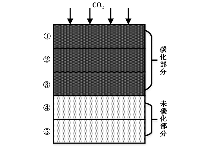 采用静压制样的方法制备水泥固化土试样:将一定质量的Pb(NO3)2粉末溶解于一定体积的去离子水中,取一定体积配制好的Pb(NO3)2溶液加入风干的黏土中,拌和均匀10 min后,将铅污染土放在密封容器内1 d,使黏土和污染物达到平衡状态。将一定质量的普通硅酸盐水泥粉末加入制备好的铅污染土中,混合搅拌10 min,将搅拌好的混合物压入内径5 cm、高度10 cm的柱状模具中。试样制好后直接脱模,并密封在塑料自封袋中,放入养护室,在相对湿度95%和温度20 ℃的养护环境下养护60 d,水泥充分反应后,将圆柱体试样的一端和侧面密封,保证CO2气体只能从试样的另一端进入。将试样放入碳化试验箱以单侧碳化的方法进行加速碳化。碳化试验箱的环境为CO2体积分数20 %、相对湿度70%、温度20 ℃。
