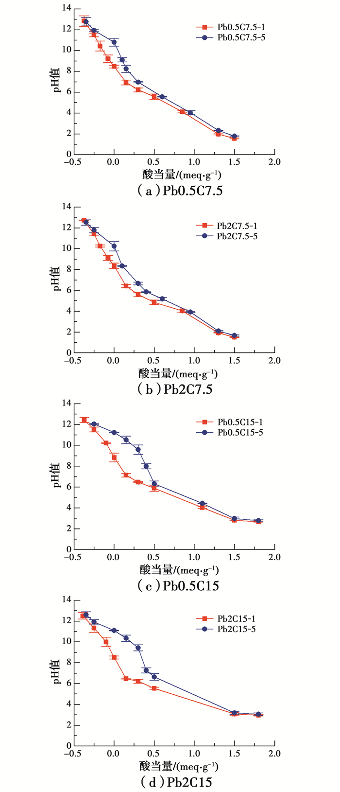 酸/碱滴定试验和pH相关溶出试验方法参见US EPA Method 1313[19]。将固化土样品风干磨细,过0.3 mm筛后,取20 g试样放入体积为250 mL的聚乙烯瓶中。将预先配制的浓度为2 mol/L的HNO3溶液和浓度为1 mol/L的KOH溶液与去离子水配制成目标pH值的200 mL浸提液。浸提液有10个目标pH值,包括天然pH、2.0、4.0、5.5、7.0、8.0、9.0、12.0、13.0、10.5,分别对应污染物在碳化过程中可能出现的10种pH值环境[19]。将20 g完全干燥的样品与200 mL浸提液混合,液固比为10 mL/g。将其放置在翻转振荡仪中,在室温20 ℃下以28 r/min的转速翻转振荡24 h。振荡结束后,取出并静置15 min,用离心机以4 000 r/min的转速离心处理10 min。测定浸出液的pH值,并采用0.45 μm的滤膜过滤浸出液,取10 mL左右浸出液测试溶液中铅离子浓度。根据《水质65种元素的测定电感耦合等离子体质谱法》(HJ 700—2014)[20],采用电感耦合等离子体质谱法测定铅的浓度。3个平行试样测得的pH值和铅浓度的标准差均小于5%。根据测得的浸出液pH值与HNO3或KOH加入量的关系,即得到酸/碱滴定曲线;根据测得的浸出液中铅的溶出浓度与pH值得到两者之间的关系。