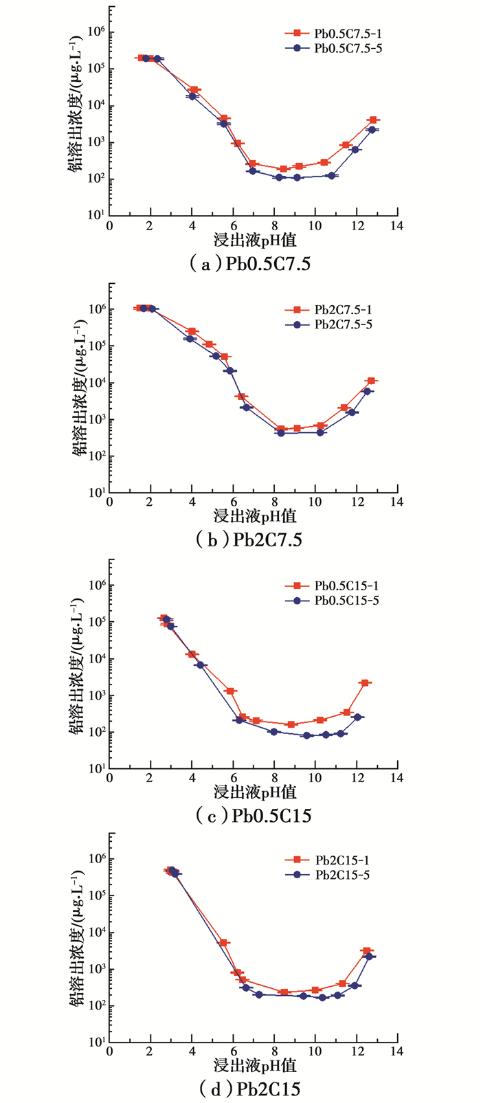 由pH相关溶出试验得到的水泥固化土试样Pb0.5C7.5、Pb2C7.5、Pb0.5C15和Pb2C15的铅溶出浓度与浸出液pH值的关系如图 4所示。由图 4可知,随着浸出液pH值的增加,铅的溶出浓度先减小后增大。当pH值介于7~11之间时,铅的溶出浓度相对较小;当pH值小于7时,随着pH值降低,铅的溶出浓度显著增大;当pH值大于11时,随着pH值增加,铅的溶出浓度也增大。这体现出铅作为两性金属的典型特征:既能和酸反应,也能和碱反应。因此,在pH值较小或较大时,铅的溶出浓度都较大。