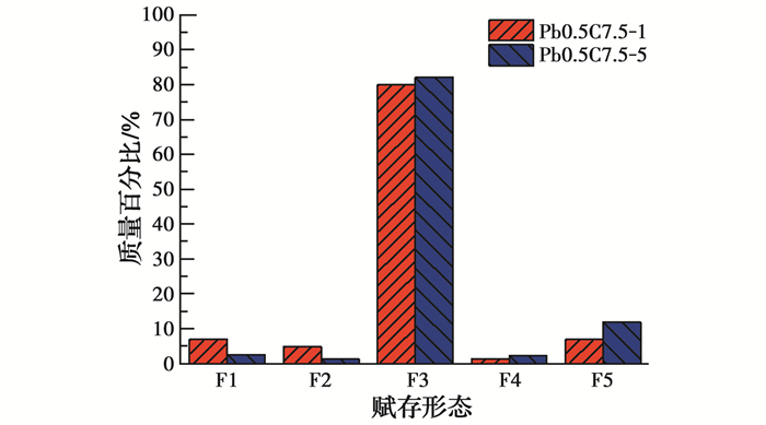 采用Tessier五步连续提取法测得试样Pb0.5C7.5-1和Pb0.5C7.5-5中铅的化学赋存形态,如图 5所示。图中F1、F2、F3、F4和F5分别表示铅的5种化学赋存形态:可交换态、碳酸盐结合态、铁-锰氧化物结合态、有机结合态和残余态。固化土中铅的化学赋存形态以铁-锰氧化物结合态为主,其质量百分比约为80.0%,可交换态、碳酸盐结合态、有机结合态和残余态所占比例均较小。试验结果与Wang等[24]关于固化污染土的测试结果相似,说明固化土中的铅主要以铁-锰氧化物结合态的形式存在。碳化作用下,水泥固化土中可交换态和碳酸盐结合态所占比例分别增加4.3%和3.5%,而铁-锰氧化物结合态、有机结合态和残余态所占比例分别减小2.1%、0.9%和4.8%。碳化作用下可交换态所占比例增加了4.3%,说明水泥固化土中的铅更易溶出,同时也验证了碳化作用下水泥固化土中铅溶出浓度增大的结果。而碳化作用下碳酸盐结合态所占比例增加了3.5%,这是由于固化土中生成了新的碳酸铅沉淀。