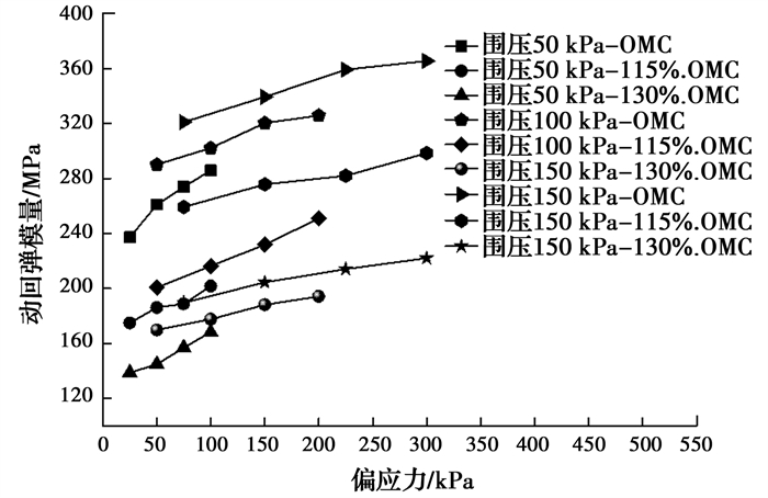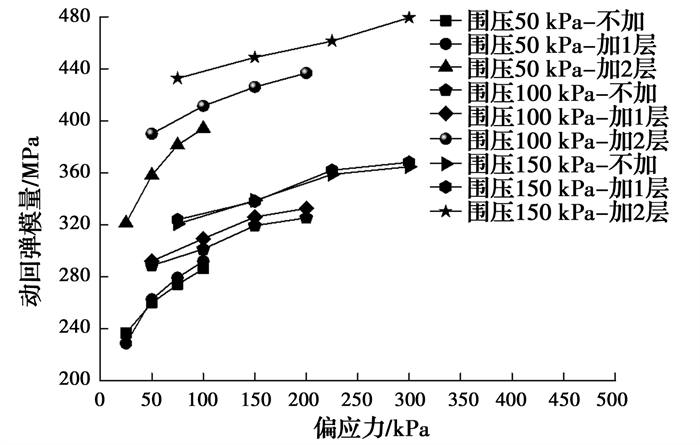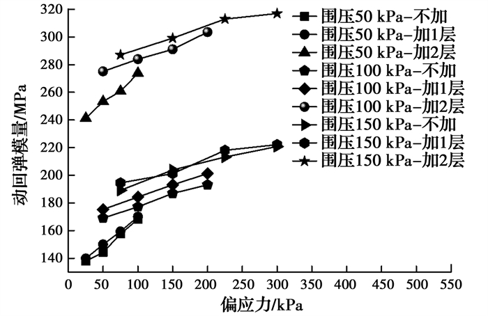 单独分析在最佳含水率且加两层筋时,试件动回弹模量随循环偏应力的变化情况。在50 kPa围压下,当偏应力由25 kPa增大到100 kPa时,回弹模量增大了3.32%~11.41%,平均增大7.08%;在100 kPa围压下,当偏应力由50 kPa增大到200 kPa时,回弹模量增大了2.50%~5.47%,平均增大3.85%;在150 kPa围压下,当偏应力由75 kPa增大到300 kPa时,回弹模量增大了2.82%~3.90%,平均增大3.47%。