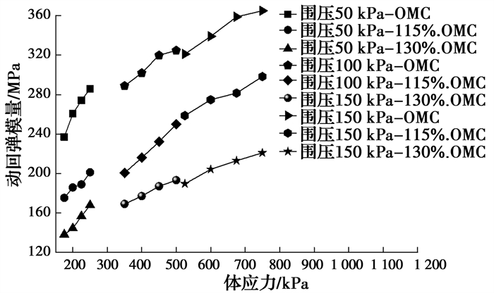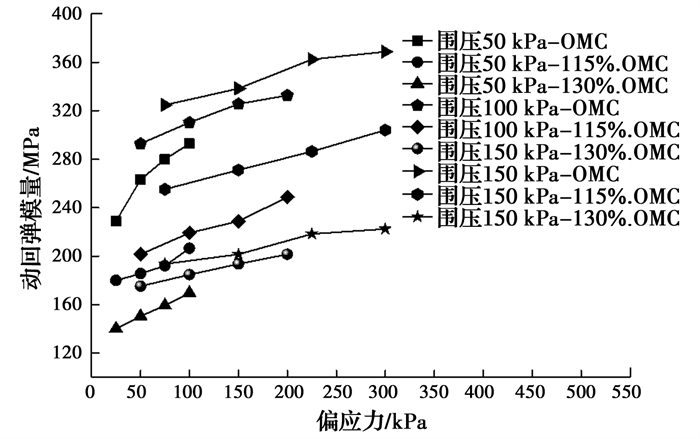 由此可见,循环偏应力对动回弹模量的影响与八面体剪应力一致。由图 2~图 7可以看出,当围压保持在一个固定数值时,测得的动回弹模量值随偏应力的增大而呈现非线性增大,同理,动回弹模量也是随八面体剪应力的增大而呈现非线性增大。分析原因可知,当围压保持不变时,随着循环偏应力的增大,试件的竖向变形也随着增大,但由于此时竖向变形及应变增大的幅值小于循环偏应力增大的幅值,所以此时试件的动回弹模量是呈现增大趋势的。
