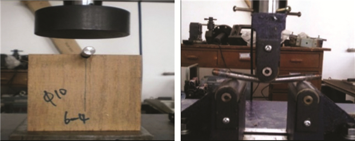 因重组竹销槽承压强度和螺栓抗弯强度均与螺栓直径有关[19],根据ASTM D5764-97a和ASTM F1575标准相关要求,分别对重组竹半孔销槽承压强度和螺栓抗弯强度进行测试(图 1),试验结果见表 1。