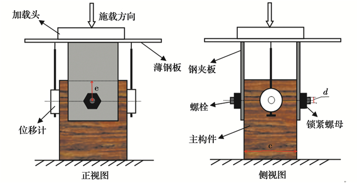 节点性能是建筑结构载荷传递及整体安全性能的关键,更是结构设计的核心[1-2]。螺栓连接节点因具有制作简单、安全可靠和施工方便等优点,在建筑结构领域广为应用[3-4],也是现代木结构的首选连接方式。目前,学者们对木材螺栓连接的研究已较为广泛,早在1932年,Trayer[5]就基于轴向压缩加载试验提出了螺栓连接设计公式; 1949年,Johanson[6]提出了以预测连接强度为基础的屈服理论模型,用于计算各种形式排布的螺栓连接节点承载强度; 而后,Doyle等[7]、McLain等[8]及Soltis等[9]诸多学者均证实了上述结论的有效性和适用性,并对螺栓直径、主侧构件厚度、加载方式、含水率、螺栓排布方式等因素对螺栓连接承载性能影响进行了研究,为后续木结构螺栓连接奠定了理论基础。相比而言,中国在木材螺栓连接领域的研究起步较晚,以哈尔滨工业大学[10-11]、南京工业大学[12-13]及同济大学[14]等为代表的科研院所在木结构螺栓连接方面开展了系列研究工作,为中国现代木结构结构设计提供了一定的理论指导。