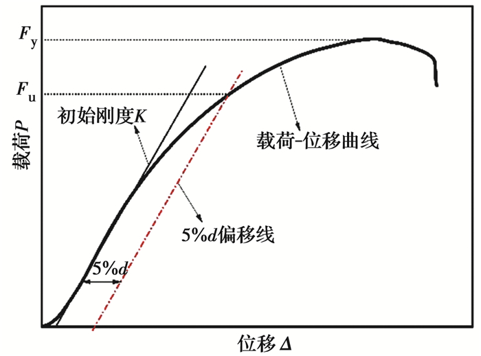 选取螺栓直径、主构件厚度及端距为试验因素进行正交试验设计(表 2),共16个试验组,每组试验重复数为3,共计48个试样。试样加载前,在节点试样两侧分别安装位移计(型号为DDP-20A)后,按ASTM D5652要求进行单轴压缩试验,并将两侧安装的位移计实测均值作为各个螺栓节点试样的实测位移。试验采用30 T微机控制万能力学试验机(型号为WDW-300E),以1 mm/min的速度实施单轴匀速加载(图 2),直至节点试样破坏或承载力下降至80%的最大载荷,便可停止加载。每个试样加载历程约持续15 min,加载过程中采用静态应变采集仪(型号为TDS-530)实时采集载荷和位移数据,并采用美国木结构设计规范NDS-2005规定的5%螺栓直径偏移法获取节点的屈服载荷,节点承载载荷峰值点所对应的载荷即为极限载荷,具体取值方法详见图 3。最后,采用Origin软件,根据曲线的几何特征作图,获取每一节点试样的Foshci理论模型参数P、Δ、M0、M1及k(图 4)后,再基于Foshci理论模型各参数之间的数学关系(式1),利用Origin软件绘制出每一节点试样的Foshci曲线图。