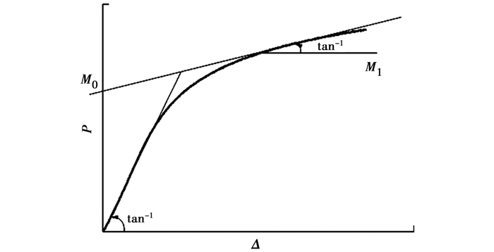 式中:P为载荷,kN; Δ为位移,mm; M0为屈服后渐近线在Y轴上的截距,kN; M1为屈服后刚度,kN/m; k为线弹性刚度,kN/m。