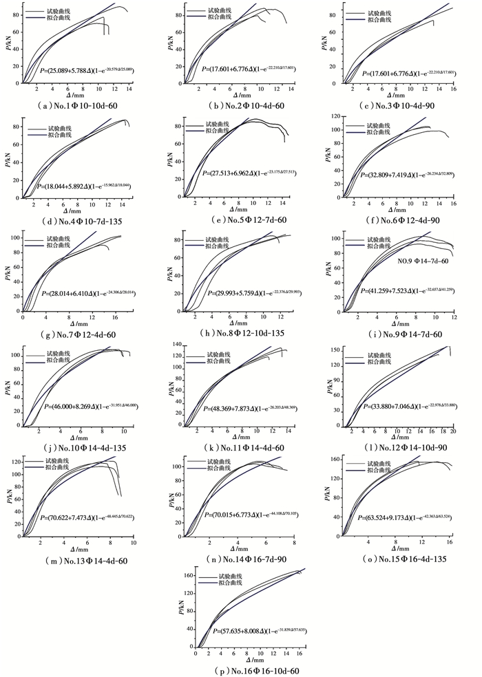 Foschi理论模型基于弹塑性理论而来,它是描述钉、螺栓、齿板等连接载荷-位移曲线的经典公式(式1),但其参数均需试验测定且随节点参数设置、载荷条件等变化较为敏感,尤其是M0和M1[20]。通过对16组节点试样的载荷-位移曲线和Foshci理论曲线比较发现(图 5),两者的变化趋势基本一致,且在某些部位能够完全吻合。由于节点试样组装时主侧两构件之间存在细微间隙,导致载荷-位移曲线在加载初期有一小段呈非线性状,随着载荷增加至一定程度后才逐渐进入线弹性阶段,故曲线初始阶段的吻合程度稍有差异。但总体而言,Foschi理论曲线能反映节点线弹性阶段和屈服后阶段的变化特征,能较为全面地反映节点整个受力过程,这也说明Foschi理论模型的非线性修正指数函数用以描述重组竹-钢夹板螺栓连接节点的承载性能具有适用性。