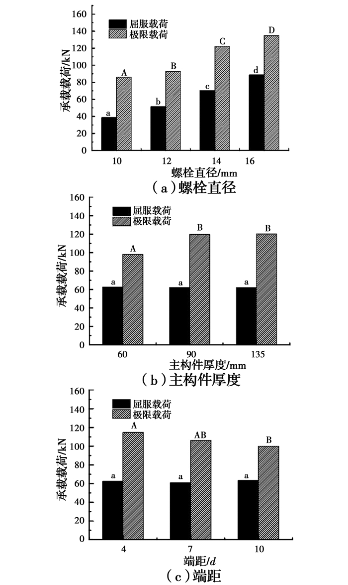 通过方差分析和多重比较(α=0.05)发现,螺栓直径对屈服载荷和极限载荷影响均显著(P值均为0.000),且两两试样组间均存在显著差异(同一图中的不同字母表示两者之间存在显著差异; 反之,两者间无显著差异); 主构件厚度和端距对屈服载荷影响不显著(P值分别为0.324、0.811),但对极限载荷影响均显著(P值分别为0.006、0.000),说明极限载荷受螺栓直径、主构件厚度及端距三因素共同影响,与前人得到的单螺栓极限载荷受端距和厚径比影响的结论一致[21],同时也反应出当螺栓连接节点达到最小尺寸设计要求时,其承载能力受螺栓直径影响作用最为明显。