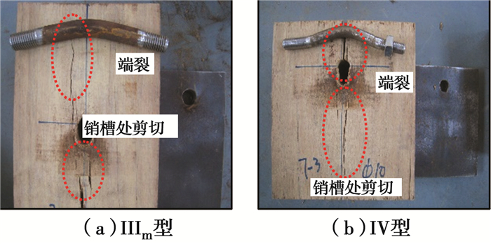 16组节点试样均以Ⅲm型和Ⅳ型屈服破坏模式呈现,其中,螺栓直径为10、12 mm,节点多为Ⅳ型,而螺栓直径为14、16 mm的节点以Ⅲm型呈现(图 7)。由于主要侧重对节点承载力的预测分析,在此对节点的破坏模式、刚度、延性率等其他性能不过多地做比较分析。