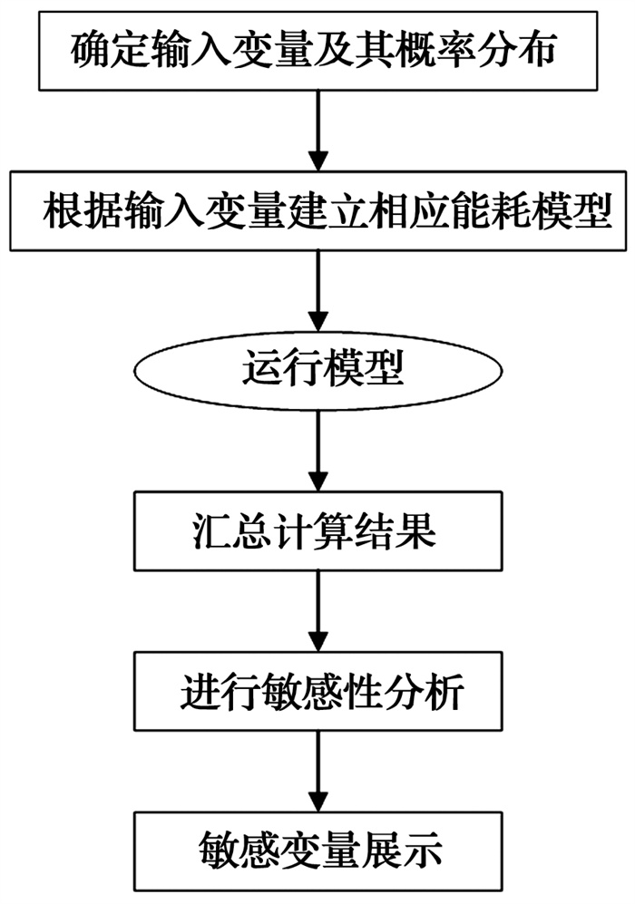 敏感性分析方法可分为局部敏感性分析和全局敏感性分析。所谓局部敏感性分析,是指固定待研究参数之外的其他参数,依次分析每个变量对目标变量的影响大小。而全局敏感性分析是指所有变量同时变化,综合分析各个变量对目标参数的影响。局部敏感性分析计算量小,但忽略了参数之间的相互影响;全局敏感性分析计算量大,但更加可靠,其一般步骤如图 1所示。首先,确定输入变量和分析目标,建立输入变量和目标之间的映射关系,可用物理模型或者数据驱动模型建立映射关系;其次,需要确定每个输入变量的取值范围和概率分布,并据此进行抽样,得到输入变量矩阵,常用的抽样方法包括拉丁超立方抽样、蒙特卡洛抽样等通用抽样方法,另外,如Morris抽样与敏感性方法对应;接着,根据输入矩阵的抽样值建立若干个模型,计算得到对应的输出结果;最后,量化各输入变量对输出变量的影响程度,得到每个变量的敏感型指标值。表 1中列出了采用敏感性分析进行建筑能耗分析的相关研究。通过文献阅读分析,笔者发现建筑能耗相关的既有敏感性分析研究侧重于某一应用场景,得到的敏感变量也不尽相同,这主要是由于边界条件及分析目标的不同引起的。在某一场景下得到的敏感变量不能简单套用到其他场景。另外,既有的建筑能耗相关的敏感性分析研究主要集中在建筑系统的理论设计参数上,如围护结构热性能、设备效率等,没有涉及建筑外形的分析,并且对建筑空调能耗也可能产生重大影响的表征建筑质量和系统运行水平的因素也被忽略了。笔者提出的关键变量筛选方法不仅考虑了包括建筑外形在内的理论设计参数,而且考虑了与施工质量和系统运行水平相关的因素,这些因素被称为“附加因素”。