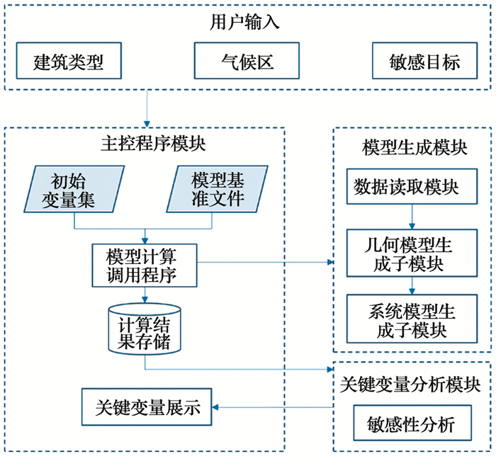 主程序控制模块用来读取用户输入信息,生成与目标建筑类型一致的基准模型文件,控制子程序的调用、算例的存储和读取以及关键变量的展示。用户输入信息包括建筑类型、所在气候区或地区、分析目标(可以为冷、热负荷或空调设备能耗),这些信息属于边界条件,会影响到最终变量的敏感型排序。