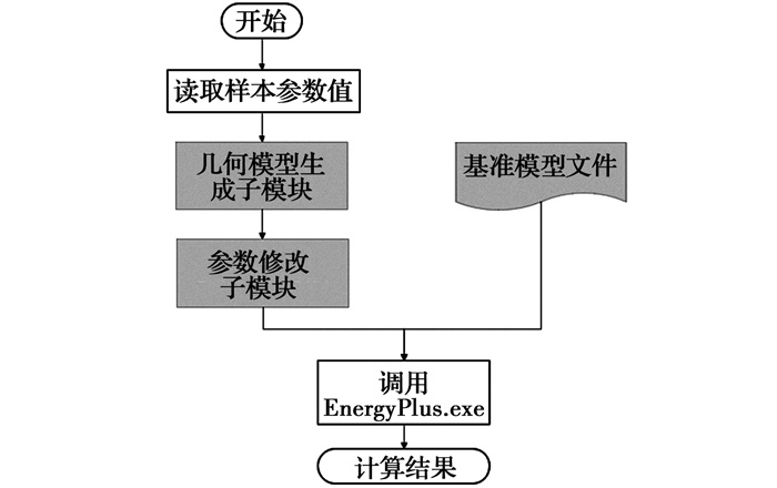 模型生成模块的主要功能是建立与输入参数(即由初始变量集抽样得到的若干组参数)对应的能耗模型。对于一个能耗模型,几何部分和系统部分分开建模。几何模型建立的具体工作流程如图 3所示,主要包括3个部分:基准模型文件读取;几何模型生成子模块;参数修改子模块。基准模型文件包含目标类型建筑的基本参数设置、时间表设置、功能空间分配等与建筑类型对应的基本信息,这些参数在整个分析过程中保持一致。几何模型生成子模块的目标是建立与采样参数匹配的建筑模型(包括一个建筑的窗、墙、楼板等部分的位置信息以及除空调设备之外的室内设备参数设置)。参数更改子模块是根据样本值自动更改模型参数(即人员密度、冷风渗透率及照明功率密度等),并创建相应的IDF文件。系统生成模型的功能类似,在几何模型的基础上添加空调系统设备的相关信息和参数。完成上述准备步骤后,调用建模引擎(即EnergyPlus.exe)进行批量建模计算,并存储相应的输出结果,以便进行下一步的敏感性分析。