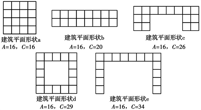 在所有建筑几何形状相关的参数中,建筑体型系数反映了建筑的紧凑度,是建筑形状的简化数学表示。较高的紧凑度意味着建筑的表面暴露在室外环境较少,对建筑能耗有很大的潜在影响。但是要对体型系数进行参数分析是比较困难的,需要建立与体型系数对应的建筑外形,目前,现有的参数分析工具(如JEPlus[17])无法达到这一目的。几何模型生成子模块解决了建筑物形状自动匹配采样参数的问题。笔者建立了建筑外形库来表征不同的建筑紧密程度,包含了5种基本的建筑形状,如图 4所示。建筑平面形状a~e的面积相等,周长递增,因此它们的紧密程度递减。笔者提出了sigma因子来表示每个形状的紧密型。