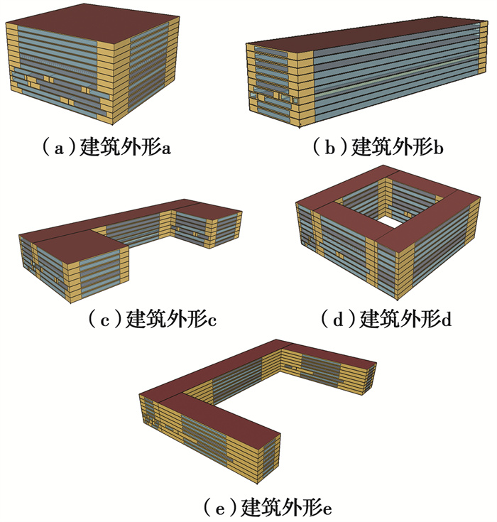 式中:C为建筑占地面积的周长;A为建筑占地面积;Atotal为建筑面积;NL为建筑层数。通过这种方式,几何模型生成模块可以找到最合适的建筑形状来匹配给定的参数(即建筑面积、层数、体型系数),从而完成几何模型的建立。该模块开发的不同形状的三维模型如图 5所示。相比于既有工具,开发的工具可分析与建筑体形相关的参数,更加灵活全面。