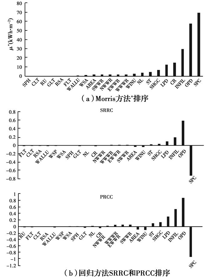 基于敏感性分析进行关键变量的提取。建筑能耗分析常用的全局敏感性分析方法有回归法、Morris法、Sobol法和FAST法[18]等。考虑到回归方法和Morris方法的便利性及有效性,笔者采用了这两种方法。