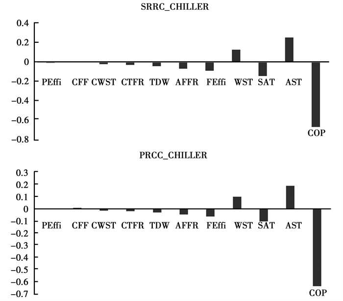 在第2阶段进行系统相关变量的敏感性分析时,由于Morris方法的特殊性,要求每个变量的变化维度相同,但对于非数值型变量,如系统类型,仅有3个变化水平。因此Morris方法不适用,这部分只使用了回归方法。数值型变量采用拉丁超立方采样方法共生成600个样本,结合两个非数值变量(风系统类型和水系统类型)的9个组合,共得到5 400个样本。回归方法的各敏感性指标排序如图 7所示。确定冷机的COP、AST和WST作为系统相关的关键变量。