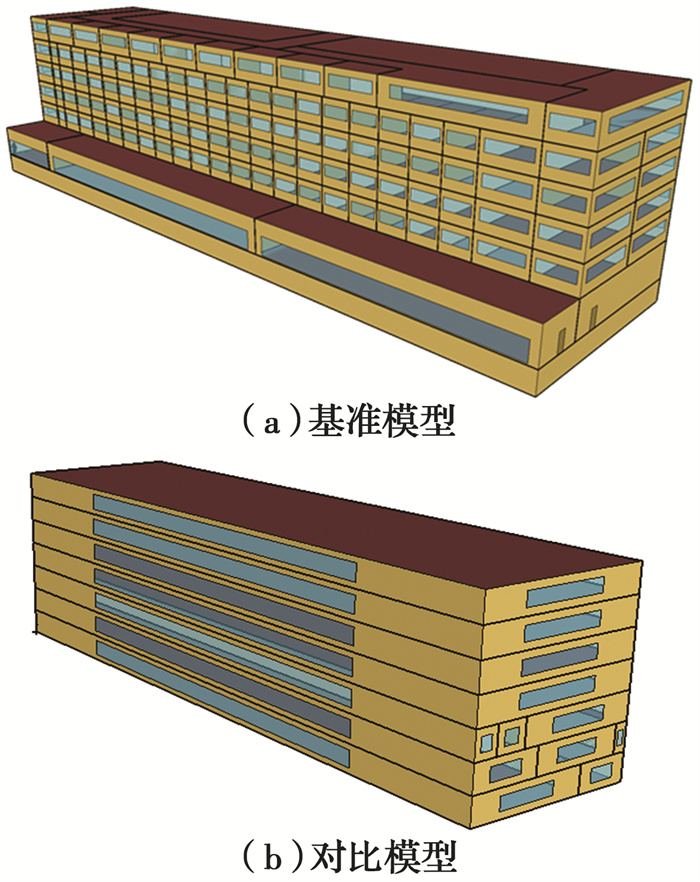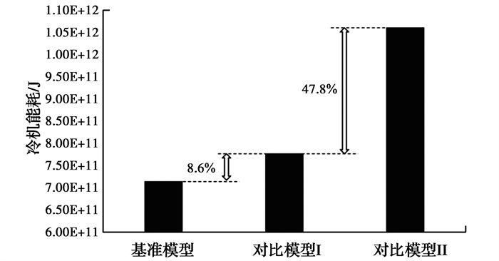 为了验证所提关键变量提取方法的有效性,基于一栋典型酒店建筑模型进行了对比分析。酒店建筑模型来自美国DOE的典型建筑模型库[21],可以反映酒店建筑的基本特征,其外形如图 8(a)所示。在对比分析中共设置了3组模型,基准模型即为原典型酒店建筑模型,没有经过任何更改。与基准模型相比,对比模型I保持关键变量不变(关键变量为表 4中加粗部分),与基准模型一致,仅改变非关键变量的值。而对比模型Ⅱ同时改变了关键变量和非关键变量。模型参数设置如表 4所示,各参数值的变化都朝着提高输出变量(即冷机能耗)的方向作改变,对比模型的外形如图 8(b)所示,与基准模型相比,对比模型有相同的面积和层数,外形简化为体形系数相同的长方体。3组模型的冷机能耗计算结果如图 9所示。很明显,两组对比模型的计算结果差异很大。在保持关键变量与基准模型相同的情况下,虽然两组模型的外形不同,但对比模型I的冷机耗电量与基准模型偏差仅为8.6%。而当关键变量发生变化时,偏差显著增加至47.8%。这证明了分析得到的关键变量对冷机耗电量有显著影响,验证了所提的关键变量提取方法的可行性。