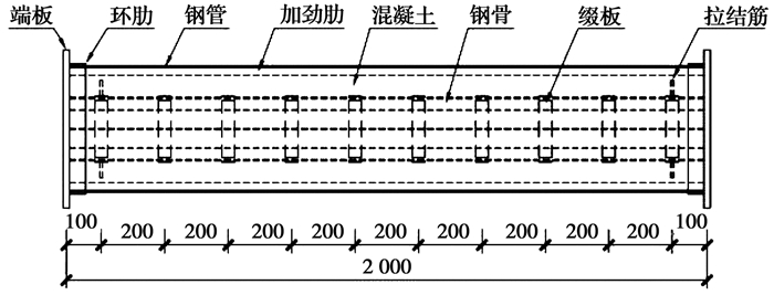 综上所述,学者们对内配纵向加劲肋、工字钢、钢骨等钢管混凝土构件的受压、受弯性能开展了一些研究,但对具有良好力学性能的格构式钢骨钢管混凝土组合构件缺乏充分的试验和理论研究。笔者对外钢管带纵向加劲肋、同时内配格构式钢骨的钢管混凝土构件的受弯性能开展研究,探究该类构件在纯弯荷载作用下的受力性能、破坏模式,明确其受力机理,并采用相关规范对试验试件的抗弯承载力和刚度进行计算,将计算结果与试验结果进行对比。