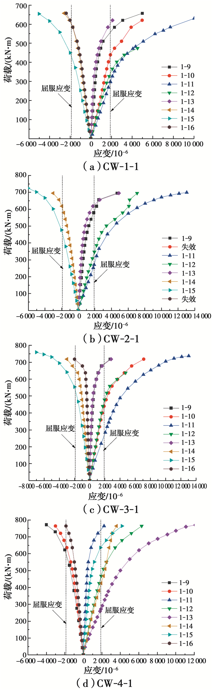 对比各试件应变发展情况可知,所有试件受拉区钢管屈服时所对应的弯矩接近,均为300 kN·m左右,各试件应变发展的主要差别在于受压区钢管屈服时所对应的弯矩。相比于未加劲试件CW-1和带纵向加劲肋试件CW-2,内配格构式钢骨试件CW-3、CW-4的受压区钢管屈服明显延迟。