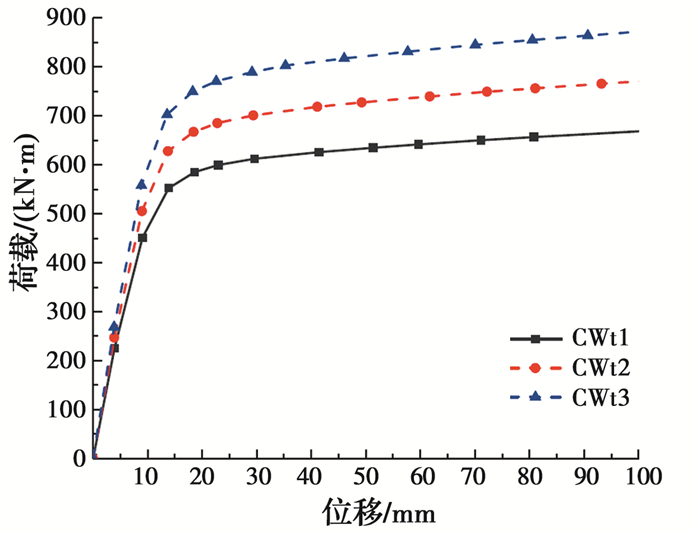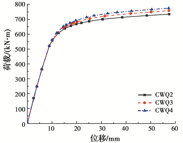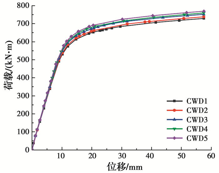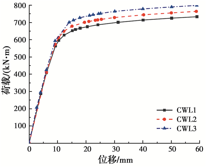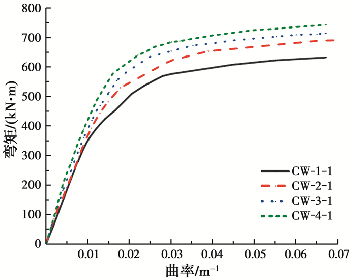 试件在试验过程中荷载下降时,极限抗弯承载力取最大荷载对应的弯矩值; 当试件延性较好、在试验过程中荷载未出现下降时,极限抗弯承载力取钢管受拉区最外边缘应变达到10 000×10-6时所对应的弯矩值[15]。各试件的极限抗弯承载力如表 3所示。由表 3可知,与内部无任何加劲的试件CW-1相比,内配纵向加劲肋试件CW-2截面含钢率提高了0.3%,极限承载力提高了5.4%;内配格构式钢骨试件CW-3截面含钢率提高了0.6%,极限承载力提高了11.3%;内部同时设置纵向加劲肋和格构式钢骨试件CW-4截面含钢率提高了0.9%,极限承载力提高了16.4%。内配纵向加劲肋或格构式钢骨均会提高试件的抗弯承载力,与试件CW-1相比,试件CW-3截面含钢率提升百分比为试件CW-2的2倍,但试件CW-3承载力提升百分比为试件CW-2的2.2倍。因此,格构式钢骨对试件抗弯承载力的提升更明显。